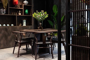 基于客戶希望獲得嫻靜和淡雅的家居空間為出發(fā)點(diǎn),設(shè)計(jì)師選用非洲黑檀木家具,其木色低調(diào)沉著,區(qū)別于中式家具常用的紅木、花梨木的偏紅黃色系,減少空間中的飽和度,其視覺效果讓人更容易“靜”下來。